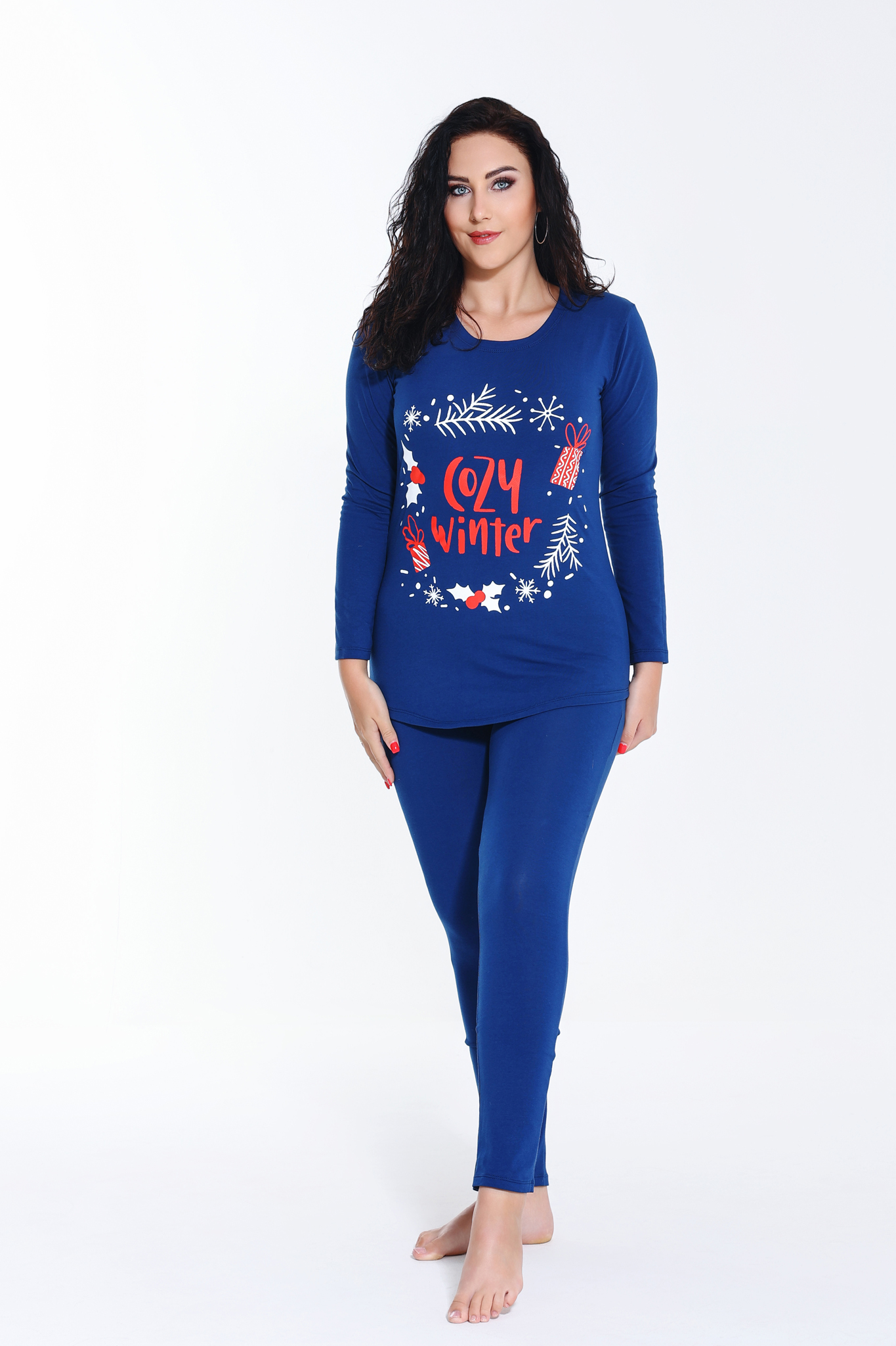 Natália hosszú ujjú és nadrágú puha minőségi pamutból készült pizsama. Felső része kerek nyakkivágással, alsó része pedig rugalmas gumírozással kialakítva. Rendkívül kényelmes éjszakai viselet. Mintáját a tél ihlette, ezáltal garantáltan meghozza a kedvünk a hosszú kuckózós téli estékhez.