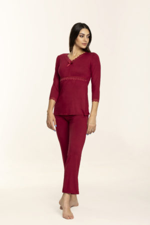 - Kényelmes fazonú pizsama, dekoltázsnál csipkével díszítve.